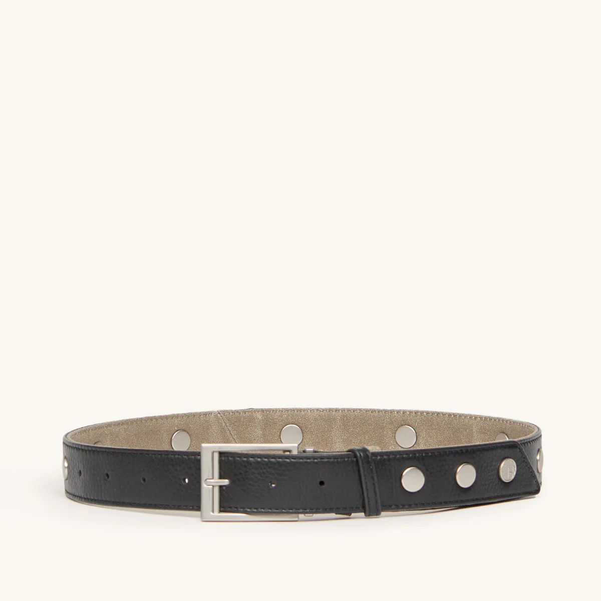 A cousin to our best selling Charles belt bag, this updated version of our reversible belt features our iconic rivets. The finishing touch? A silver buckle, engraved with a Hammitt logo. Crafted with black and pewter leather.