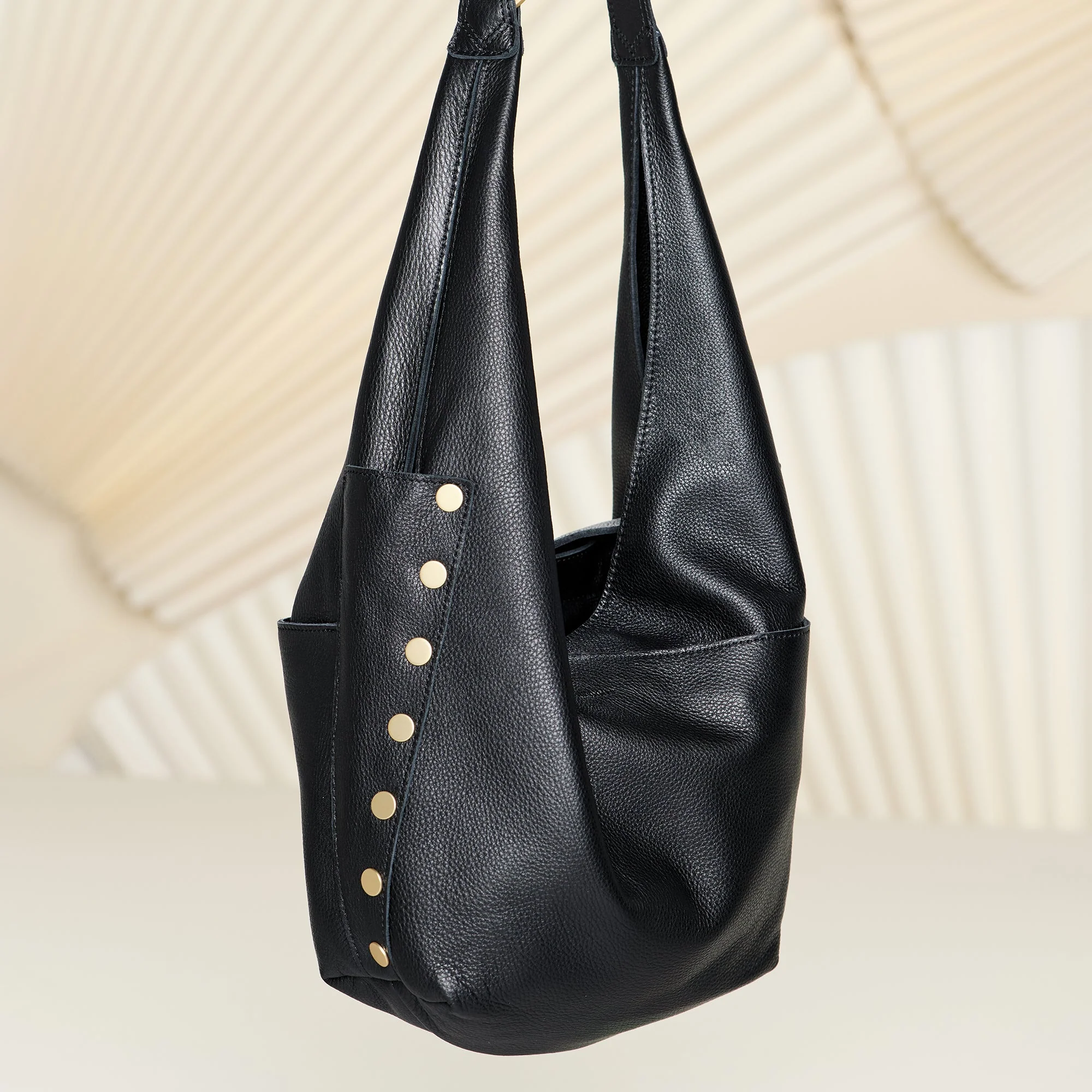 - Crafted with soft black pebbled leather